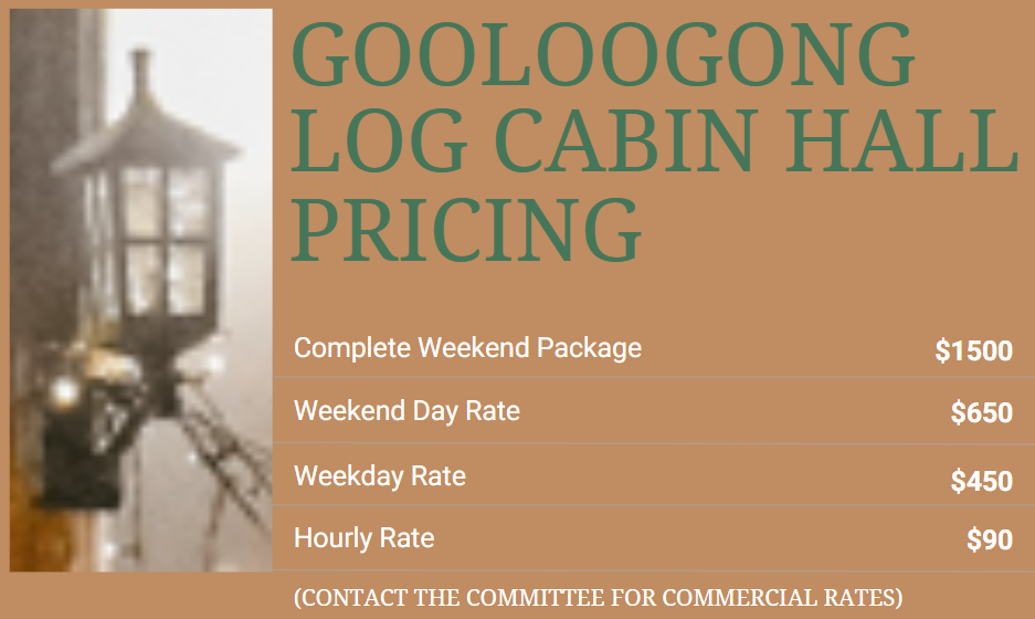 The Gooloogong Log Cabin Hall features a Proscenium Stage with a wooden deck with wing space on each side. There is separate access, two dressing rooms containing mirrors and a separate bathroom. Microphone and speakers available – please enquire.